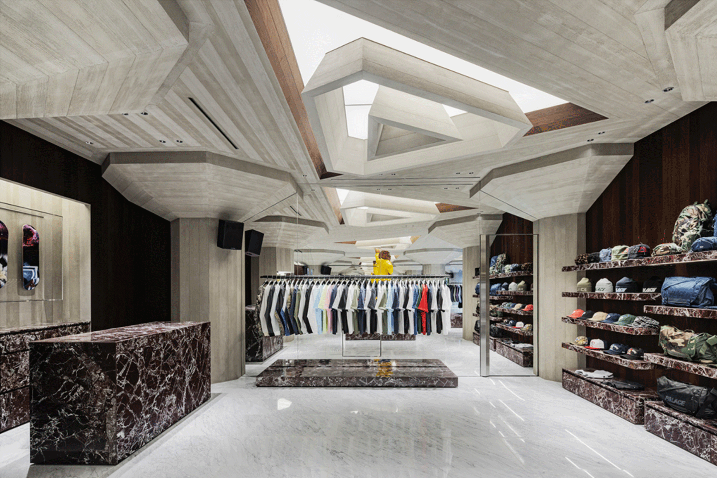 The design plays with striking contrasts: rough concrete ceilings and columns are balanced by a sleek grey marble floor, while Southbank’s signature block-like benches are reimagined in imposing slabs of red marble. At the heart of the space, the brand’s iconic bulldog statue stands proudly, while a glowing ‘P’-shaped light — styled in Palace’s distinctive slanted font — hovers above a vibrant display of skate decks.